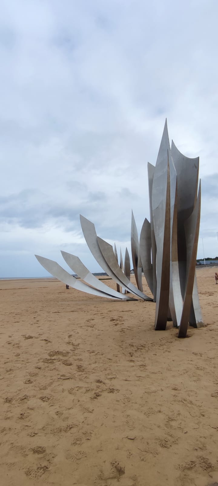 Un detour s'est imposé par la plage d'Omaha beach, surnommée "Omaha la Sanglante", où nous avons pu faire quelques pas face à la mer et observer la sculpture "Les Braves" d'Anilore Banon.